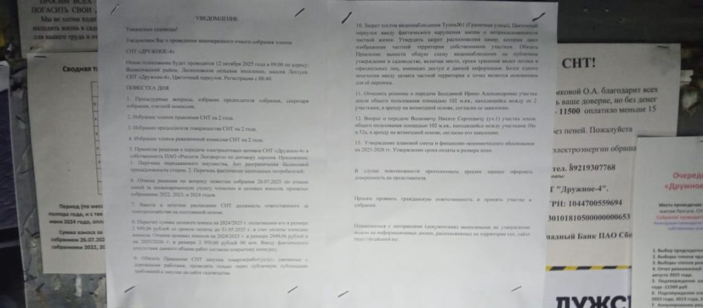 Очное голосование будет проводится 12 октября 2025 года в 09:00 по адресу: Всеволожский район, Лесколовское сельское поселение, массив Лехтуси, СНТ «Дружное-4», Цветочный переулок. Регистрация с 08:40.